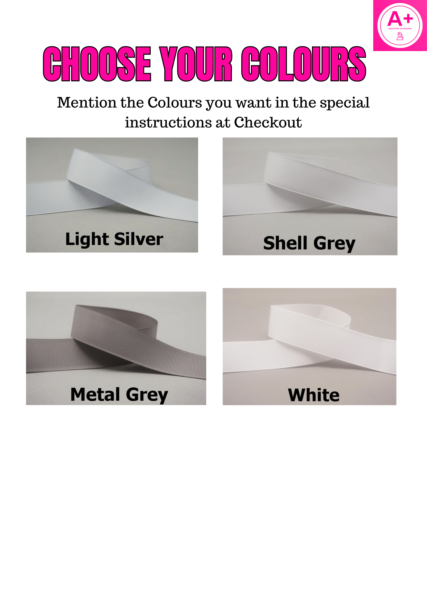 Please choose colours required from our colour images. If unsure what colours you need, please leave name of school/sporting club with suburb and state and we will assist with colour choices. Also state whether or not you want HAIRTIES or CLIPS to be attached.