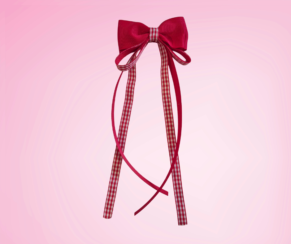 Elegant and classic, the Livvi Bow Tails are the perfect accessory for school days, special occasions, or everyday chic. With a smart red bow and long trailing ribbons, including a touch of green gingham, this piece adds both style and charm to any hairstyle.