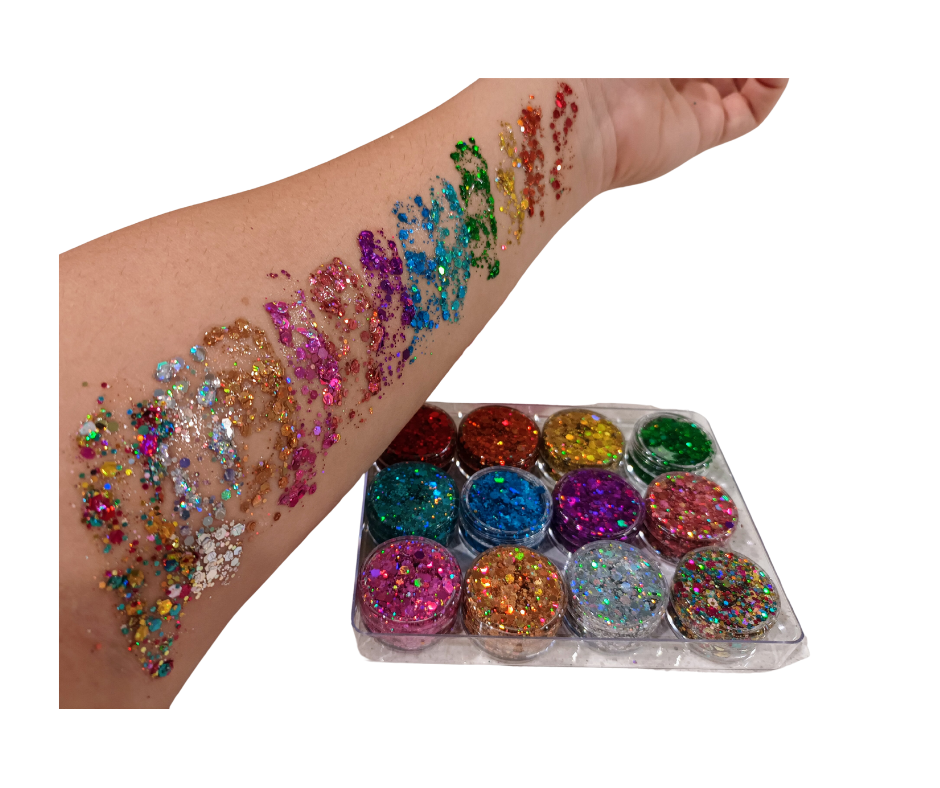 Bring the magic of colour and shine to every celebration with our Rainbow Glitter Face & Body Gel Collection. Packed with 12 dazzling shades and a handy mini brush applicator, this set is perfect for festivals, birthdays, parties, concerts, and fun-filled days with friends.